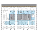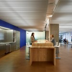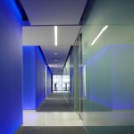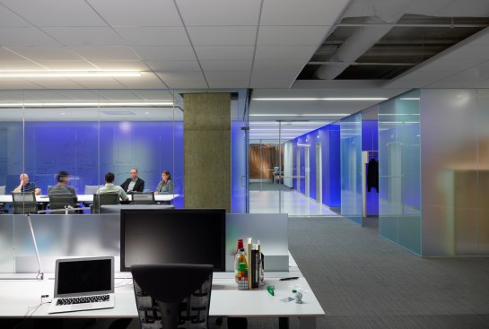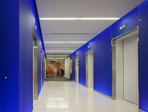 Brininstool + Lynch used several creative strategies to divide the 18,000-square-foot floor plate into distinct and recognizable zones. The elevator and stair core is enclosed in bright blue acrylic sheets that are offset from the wall and backlit to create a glowing blue box that is visible from almost every vantage point on the floor, creating an identifier and focal point. Private offices and audio/video conference rooms – enclosed in either translucent or transparent glass – surround the core on the east, west and north sides, with two of those sides facing walls of windows.