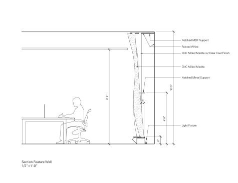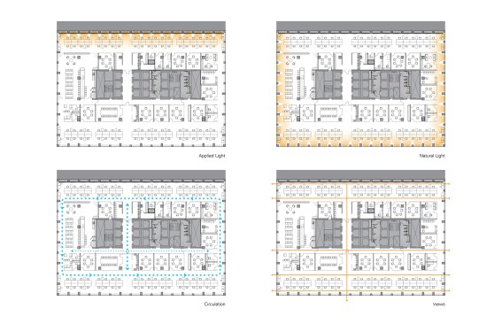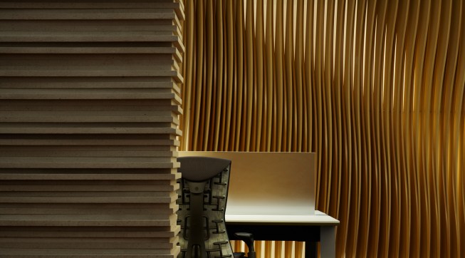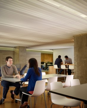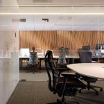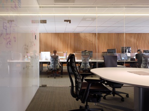 Along the west edge of the floor, where there are no windows, Brininstool + Lynch created a 150-foot-long feature wall, constructed of custom formed recycled fiberboard panels set in an irregular, undulating pattern that creates a wave-like effect. Along this glowing wall and mirrored on the east side are 130-foot-long workstations that allow programmers to work in an open and collaborative setting. The design incorporates materials throughout the space that control sound for a functional work environment.
