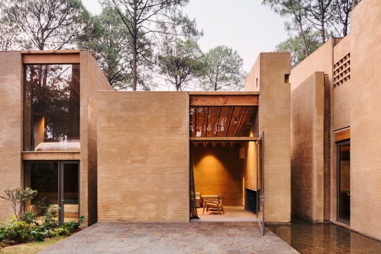 Two hours southwest of Mexico City, a complex of five sculptural dwellings stands in the town of Valle de Bravo. The architect, Héctor Barroso, principal of the Mexico City–based firm Taller Héctor Barroso, knows the area well; he’s been going there since he was a child. “It’s a very particular place,” he says, as the area features a variety of microclimates—mountains, forests, and a desert—and the town borders a prominent lake. He dubbed the residential project Entrepinos, or “between the pines,” after its forested and gently sloping site.