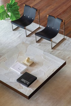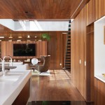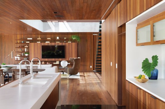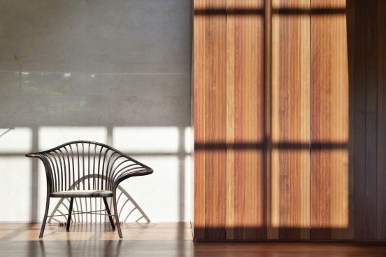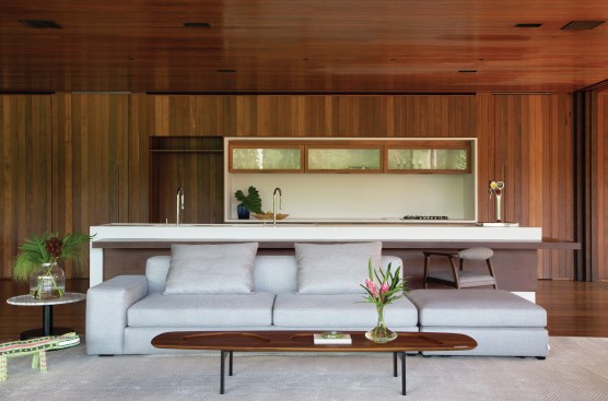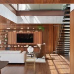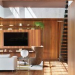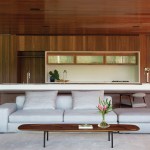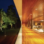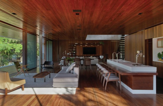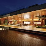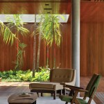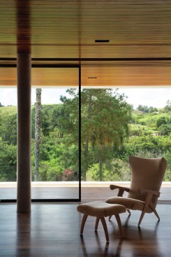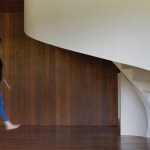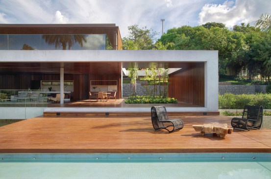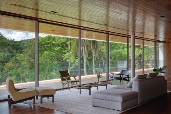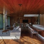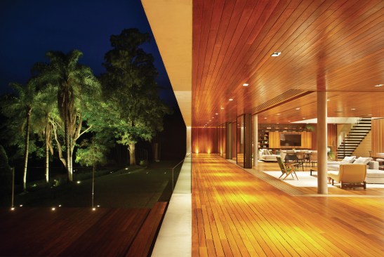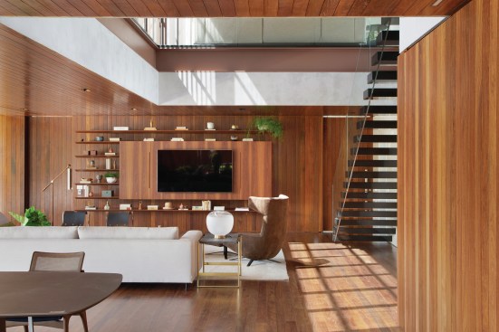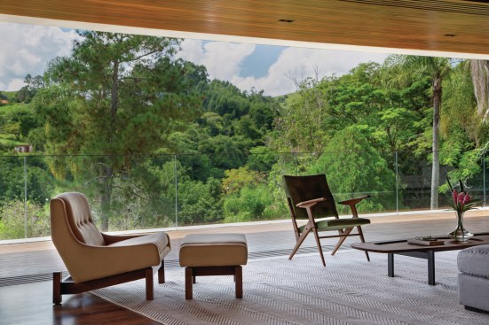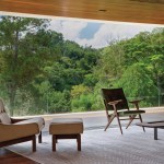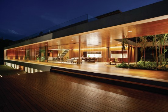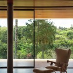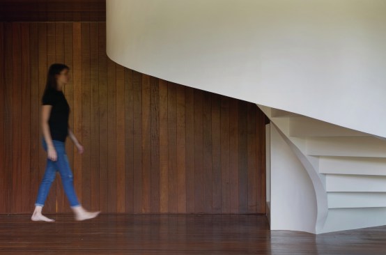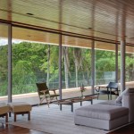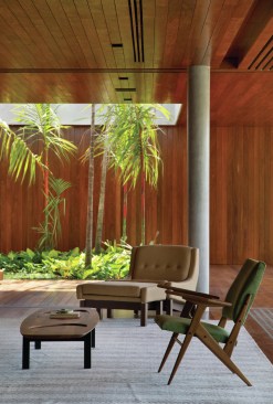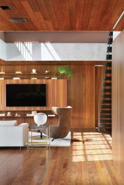 Among all the neutral tones and the natural coverings selected to create the interior design, cumaru wood is the main material and it covers the floors, walls and ceilings. The Brazilian design pieces selected for the furniture was chosen to complement the light colored rooms field with details in linen, wood, stone and leather.The stair to the upper floor has individually mounted steps wrapped with marble and the glass railing also helps to bring transparency to the house.