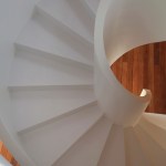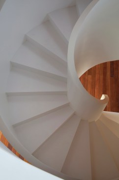 The sculptural spiral staircase, one of the highlights of the façade, welcomes the guests by giving access to both the main hall and the leisure area of the house.