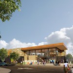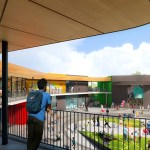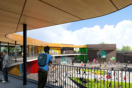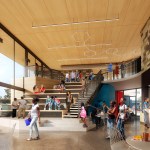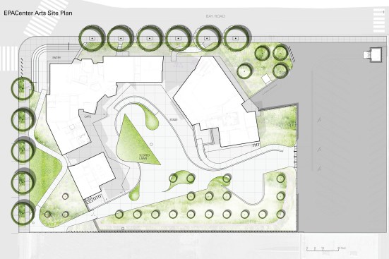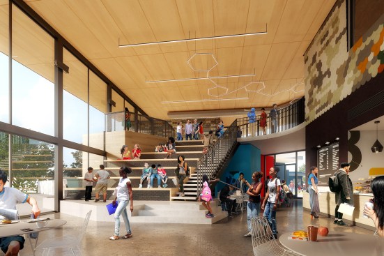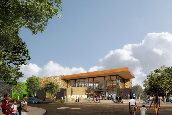 What emerged is a synthesis of architecture and community: an elevated village that celebrates the diversity of the arts–with pavilions housing different creative disciplines that operate as a dynamic collection of creative spaces, internally visible and inspiring. Areas for visual arts, a multi-use theatre, a woodshop, youth center, band room and more are clustered in separate buildings, united by an expansive roof that at once provides shelter for circulation and creates protected outdoor areas for hanging out.