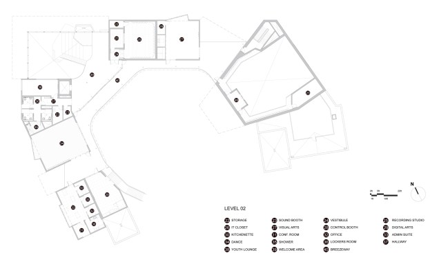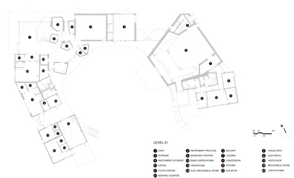 The pavilions cluster around a central courtyard creating a protective, horseshoe-shaped footprint, with two street-side façades that provide both sheltering enclosure and numerous opportunities to showcase art. The porous, village-like assemblage invites the public to participate in every area of the ground floor, strengthening connections between youth, the arts, and the community.