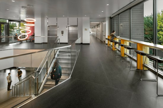 Filled with natural light during the day, and a soft glow at night, the open and airy two-story lobby intersects two wings as the heart of the building. A sculptural stair floats within this space, inter-connecting the first two floors and displaying circulation aesthetically, while encouraging use as one of the main ways of circulation. Specially designed spaces encourage student collaboration and interaction.