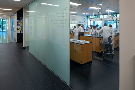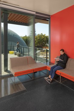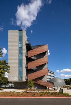 Instructional laboratories have large expanses of glass adjacent to public corridors to promote “science on display” and connect students and faculty. These corridors branch out toward the east and west from central lobbies on each floor. An observatory accessible from the building’s rooftop features a retractable roof and two telescopes to serve as a location for viewing the cosmos. The planetarium has a 2,500-square-foot dome offering a versatile high-tech environment that serves as a venue for education, public events, and field trips for local K-12 classes and surrounding Sacramento community.
