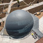 CO Architects created the façade design in homage to the nearby American River. The concept relates to the rippling effect created when a stone is thrown into water. The location of the planetarium at the building’s inward inflection point represents the stone’s impact on the river, while the patterned window system radiates outward to emulate the ripples formed. Polished, dark concrete and spandrel glass, along with vertical and horizontal concrete bands and metal sunshades, additionally signify elements of nature.
