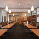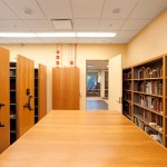 Entering via a new bridge through the main level of the existing library, visitors arrive on the top floor of the addition which contains the public functions of this three story structure. Two groups occupy the addition, the Department of Rare Books and Special Collections, and the South Carolina Political Collections. These departments share a lobby, reading room and large meeting room on the public floor, organized in sequence, on axis with the bridge. Large expanses of glazing are introduced between each of these functions to maintain daylight and views without compromising sensitive security requirements. Flanking these three common spaces are a series of seminar rooms and executive offices, as well as a large gallery either side, for each department. Moving onto the lower floors, daylight is decreased in response to the sensitive nature of the stored documents, and ultimately eliminated on the lowest level. The level below the main level contains processing spaces and staff offices, as well as the library’s digitization lab, which houses a large format Zeutschel scanner, used by both departments. The lowest level is approximately 50% below grade and contains 15,000 SF of compact shelving for storage of the collections. The stack level is maintained at 60 degrees and 40% relative humidity. A large service elevator connects the Reading Room control desk with the lower stacks for quick retrieval of materials.