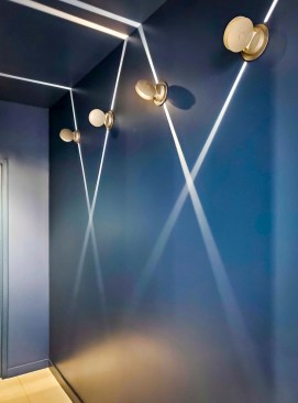An inset cube of partial height walls features slot lights creating a dynamic, playful rhythm of light. Even the hallways to the bathrooms are lit with whimsical angled light beams across the walls and ceiling. There was no skimping on lighting design opportunities in the bathrooms either. Walking through the space not only inspires designers and vendors alike but proves successful applications of lighting and their controllability.