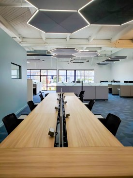 The entry features a simple backlit logo glowing through a laser-cut blackened steel panel while floating overhead rings of light turn a soaring warehouse entry into a more personable welcome. As one walks through the space, simple pendant lights balance with layered hexagonal suspended ceiling shapes, demarcating the open-office area and acting as an acoustic solution.