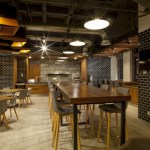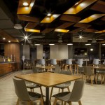 In the cafeteria a different atmosphere was sought, to disconnect from the offices and evoke a warm and comfortable environment, and thus the wood and warm colors of the lighting were very important in this space.