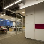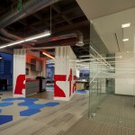 When entering the offices on any of the 3 floors what was designed was a space of visual closure, not going directly to the work stations; this allows for visual relaxation and a transition from a public collaborative space to a private work space. In this space there are informal work spaces with high chair bars and spaces for coffee and copies, integrated in a distinctive architectural element. This container which inspires the users generates multifaceted collaboration spaces, from a copies and coffee station to a formal meeting room with projector. This emblematic element of mobility reflects the values of the company and projects the image of the company to both the interior and the exterior. These containers are produced in form and geometry to scale 1:1 of a real container. This generates upon seeing them a sensation of grand realism. These steel containers painted white give us the basic essence of the element and with the interior furniture in corporate colors these spaces are connected to the container; the casual furniture of informal meeting rooms produce an equilibrium in the offices; in those spaces the slab is visible and the floor carpets are composed of random color accents that give a subtle color touch to the space.