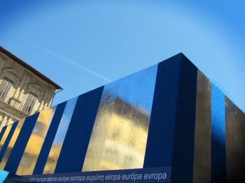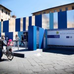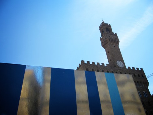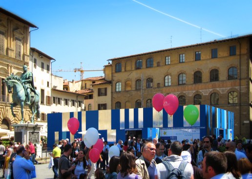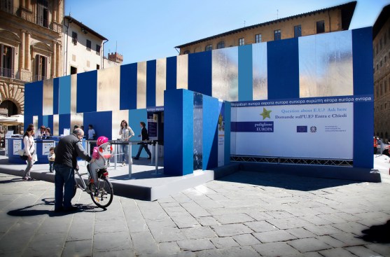 The main pavilion occupied an area of about 400 square meters next to Palazzo Vecchio and was commissioned by the EU Commission and the European Parliament. It was realized with a supporting steel structure and coated in colored MDF wood panels. The image of the pavilions was also characterized by the use of mirror films to symbolize the dialogue with the Renaissance architecture of the square.