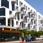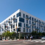 Located in downtown San Diego’s booming East Village neighborhood, EV is conceived as a piece of sculpture – its modulated façade a carefully-scaled, dynamic interplay between solid and void. The residential floors are seen as a sleek, clean, white volume supported by concrete pilotis. This volume is interrupted by a glazed wall that signifies the building’s entry on Thirteenth Avenue. The facades of the residential levels employ a shifting pattern of fenestration that changes from floor to floor. In an effect that is lively and kinetic, the windows and glass-faced balconies are patterned to respond to the unique configuration of each apartment. Overall, an elemental palette of exposed concrete, glass, and white stucco creates a minimal and contemporary aesthetic, contrasting favorably with recently-built adjoining projects, while retaining a scale and flavor appropriate to the East Village context. Inward facing apartments at the upper-level offer views to a landscaped central courtyard. Ground level units have direct access to private patios within the courtyard. The 22-foot-wide sidewalk along Thirteenth Avenue features abundant landscaping at the property line and on the street side, creating a lush, pedestrian-friendly corridor. The site is further activated by two retail spaces than anchor the building’s corners. Street-facing apartments at the first floor can also be accessed directly from the sidewalk, adding vibrancy to the building’s streetwall. EV’s distinctive common area spaces are adorned throughout with custom art installations by local artists, and include a fitness center, media lounge and 9,000 sq. ft. rooftop deck with architectural lighting, steel and wood trellises, lounge seating, fire pits, and pet area. The open, activated, and porous posture of the building enlivens its urban-infill site and enhances the broader context of East Village, serving as a catalyst for further growth in the neighborhood.