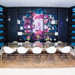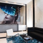 The painting’s significance is suggested in the lobby by applying the photograph’s colors throughout. The cream walls accented by black reflect the photograph’s background; the palette of blues and greens on accessories and furnishings mirror the shade on the photograph’s leaf; and the photograph’s red lipstick is embodied on other artwork found in the lobby.