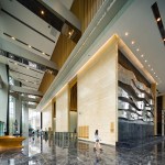 The ONE’s architectural form, space and materials drew inspirations from the natural terraced landscapes and pools of Jiuzaigou. The earth-tone granites with random patterns and texture translate the rocky element of the natural terrain into the façade design. The architecture incorporates a series of staggering terraces at varying heights to the interior space, creating a fluid form and architectural space in alignment with the overall design of the development.