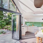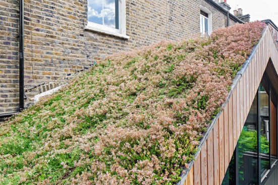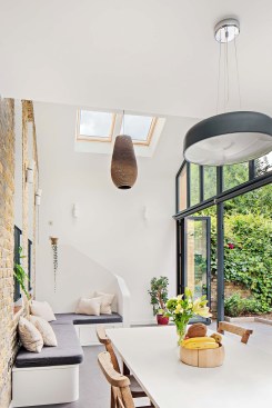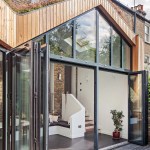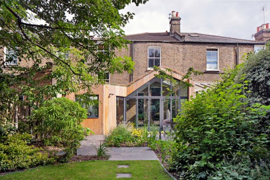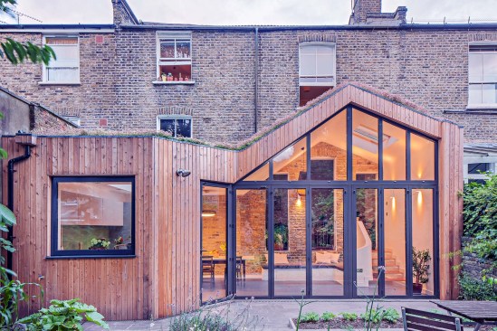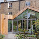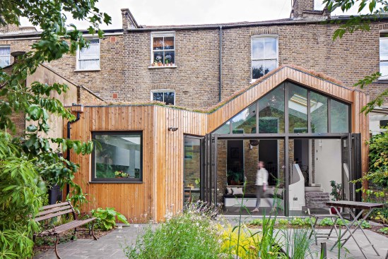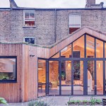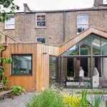 The old and new spaces are connected via a staircase through once of the original openings of the living room, leading down to the kitchen and garden level. While the newlt designed seating area at the extension is extension is integrated into the stairs. The new back façade is extensively glazed allowing for both unobstructed views to the redesigned rear garden and for light to penetrate all the way to the interior of the flat. Using Scottish larch cladding creates integration with the natural environment of the rear garden, gives a warm and pleasant view from the neighboring properties and allows for an unusually shaped volume following the curves of the design to reflect all the interior design actions. The result is a unique transitional space between the exterior and the interior of the house, creating a unique combination of both continuity and separation within the same space.