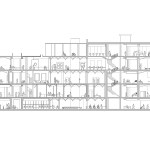 The longer volume facing south houses the collective residences that base their functionality through a microcosm of shared spaces, such as kitchens, living rooms, spaces for music, and for exercise, which open on the communal balconies oriented to the south. Residences are designed as multi-generational spaces that have a principle to aggregate a community made up of young and old, families and singles and to use resources flexibly. To make the living spaces and their support functions fully autonomous, we incorporated the north-facing balcony into a new facade, reusing the two existing stairs, and adding two elevators. The new light facade, built with operable micro-perforated panels, encloses the original envelope that remains this way unchanged and transformed into the distribution lobbies of the new residences.