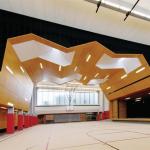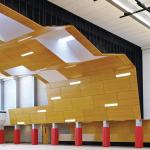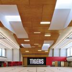 The walls of the distinctive interior are clad in sound absorbent tectum panels, and a wooden “wrapper”—inspired by sushi—focuses attention on the stage while diffusing the sound during performances. The stage can serve as a drama classroom—its space is acoustically isolated from the gymnasium by an insulated overhead garage door emblazoned with the school’s “Tigers” moniker.
