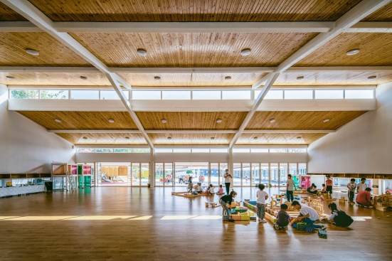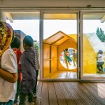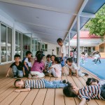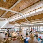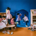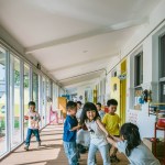 A flexible, informal learning space, the loop encourage self-directed exploration. The area under the loop supports activities that require more space, such as building large structures out of foam blocks. This space can also be transformed into imaginary environments for role-play such as a market street with food carts, and it can serve as an indoor play area when the weather is poor. Such activity is naturally led by the interests of each individual. In this way, space takes on the role of the ‘third teacher’ by supporting self-directed learning and helping to lighten the workload of teachers.