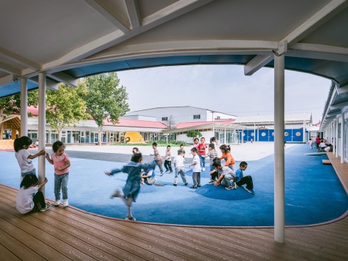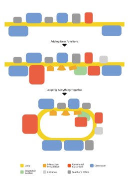 The design of the school encourages early learners to feed their curiosity and engage in creative exploration at an extremely formative period in their lives. The design introduces a covered walkway in the form of a loop that links new learning spaces to pre-existing ones. Disparate elements of the original school are woven together as a unified whole. The loop becomes a social condenser where students mix and interact with intersecting spaces and programs. Also connected to the loop is a new multipurpose hall that serves as a central column-less social space.