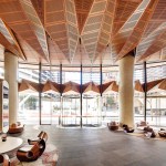 Importantly the envelope is a responsive skin, a kinetic architecture, adjusting automatically to the position of the sun and time of day to control heat load and sky glare. This progressively adjusting timber screen filters the light into a warm timber glow reaching deep into the interior.