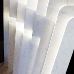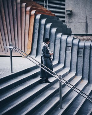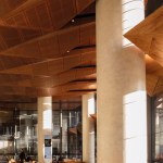 Forming a soft edge to the street and public foyer is a suspended awning of folded timber planes reaching out, protecting the footpath and reflecting light into the lobby interior. This gently curving and folding awning is like a row of trees providing shelter at the edge of the tank stream.