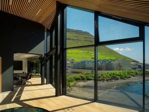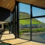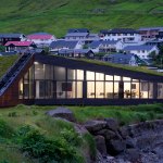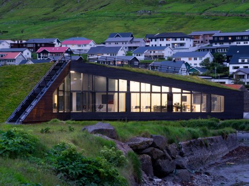 Located in the breathtaking Faroese landscape, the 750m2 green roofed town hall of Eysturkommuna completely merges with nature. The town hall bridges the river in the village of Norðragøta. Before the fishing industry made its entry with a large and important factory, the attractive local beach was the natural gathering point on special occasions. According to plan, the town hall is the first of more buildings to reclaim public life in the center of Norðragøta, and thus, the Town Hall Eysturkommuna takes on the important task of establishing a space that will revive the local community. The terraces and roof are open to the public, people can come here to have picnics and swim in the river. Eysturkommuna covers five different settlements of total 2000 inhabitants.