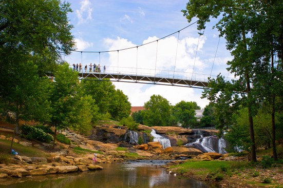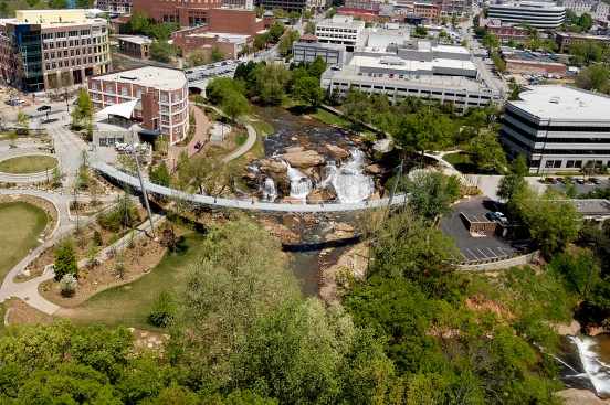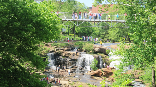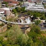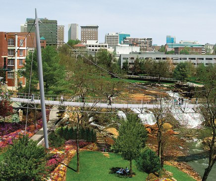 The park, completed in 2004, is the realization of a vision that began with a 1907 “Beautifying and Improving Greenville, South Carolina” report sponsored by the local municipal league that identified the river falls and gorge as “the most distinctive feature in the topography and landscape of Greenville.” Liberating the falls and creating a park was advanced by the Carolina Foothills Garden Club, which led an effort to establish the park beginning in 1967 and engaged Washington DC-based landscape architect Andrea Mains in 1987 to complete a master plan.