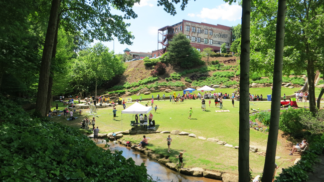 The park offers a series of sweeping vistas and winding trails interspersed with manicured greens and wooded valleys that connect the city with the river and support a diversity of activities such as walking and cycling, quiet contemplation, and picnics, as well as large events like the annual Reedy River Duck Derby. Plantings include a mix of mature trees and native plants, supplemented with vibrant annuals that provide splashes of color at key areas.