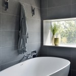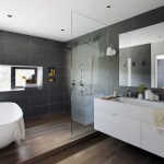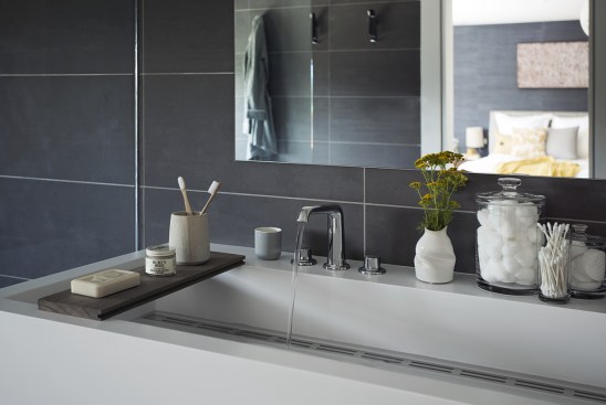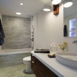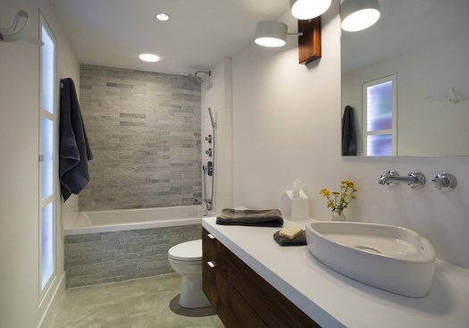 The reconfiguration of the master bathroom opened up the space by pairing a platform shower with a freestanding tub. The open shower, wall-hung vanity, and wall-hung water closet create continuous flooring and an expansive feeling. The result is a welcoming space with a calming aesthetic.