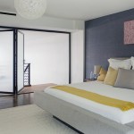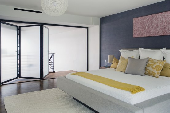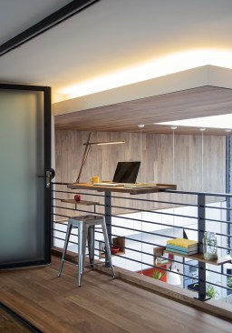 New walnut stair treads lead up to the master suite. A wall separating the master bedroom from the double height living space was replaced with a folding glass door to open the bedroom to the living space while still allowing for both visual and acoustical privacy. Surfaces built into the new railing atop the stair create a functional work area with a fantastic view and clear shot to the play space below.