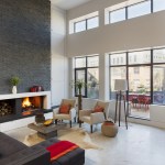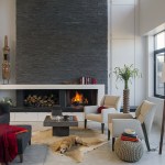 The fireplace area was re-envisioned for improved aesthetics, scale, and proportions. Former clutter-prone open shelves are now clean, functional cabinets, paired with a stone element, for added warmth and texture.