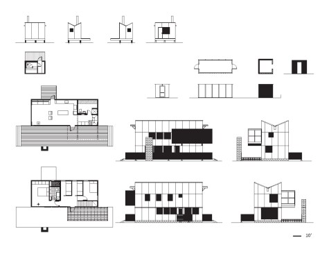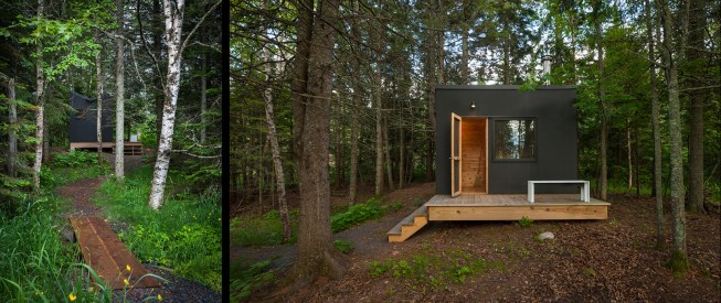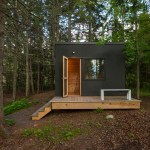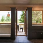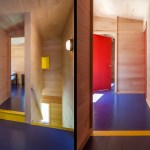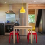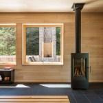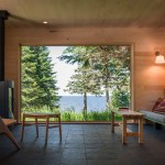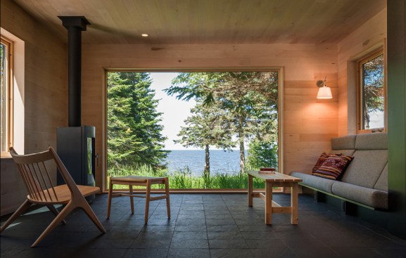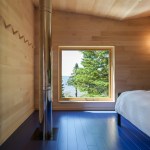 Located on the shore of Lake Superior, this small Wisconsin retreat designed by Duluth, Minn.–based Salmela Architect is a model of efficiency at 1,280 square feet. Yet its bold volumes—including a butterfly roof and a cantilevered screened porch on the second floor—give it a striking presence. Visitors first glimpse the house framed by a woodshed with vertical cedar slats and a black, paper-resin composite-clad storage building that flank the driveway, the materiality of which repeats in the two volumes of the main house. The living area extends outside with a deck bounded by a stone fireplace. Inside, pale wooden planks line the walls of the ship-like living room, and a picture window offers views of the lake beyond. A bright yellow staircase leads up to the sleeping quarters: a compact master suite, guest room, and bunkroom, all in a 16-foot-wide by 40-foot-long space. The interior is detailed like a piece of furniture, with thoughtfully designed touches like wall pegs for hanging clothes and space-saving pocket doors. —Alan G. Brake