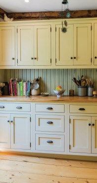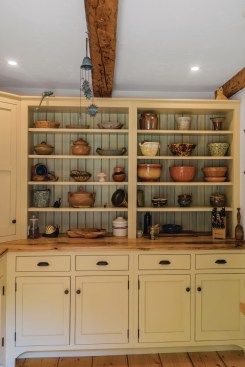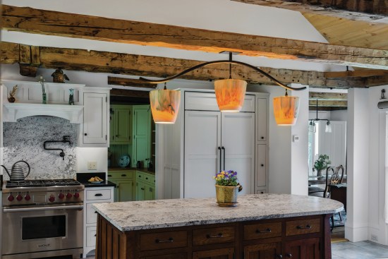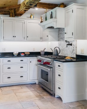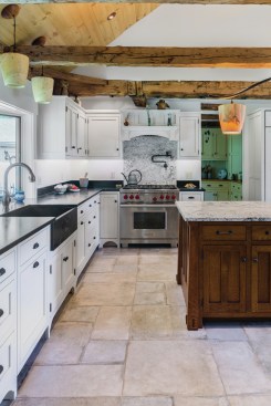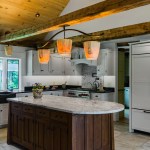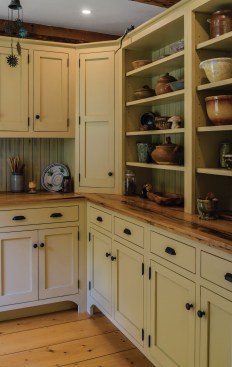 A small, dark and out dated kitchen is no place for anyone, especially the master cook that our client is. Wanting a larger and brighter kitchen, we took over the unused space of the nearby dining room and combined it with a small addition to provide ample space for the kitchen and attached pantry. Once the demolition phase revealed the beauty of the century old beams hidden in the attic and floor system above, the stage for the Farmhouse Kitchen of our customer’s dreams was set. New custom Crown Point cabinets replaced the old, providing ample storage and countertop space. The openness of the kitchen allowed for a larger island, giving the owner plenty of work space and seating. Glazing on the cabinets and soapstone counters adds to the rustic farmhouse charm of the kitchen. The new large bay window, full lite front door and cathedral ceiling add light and warmth to the kitchen. Accent lighting hidden on top of the beams help to show the warmth and charm of the rough sawn pine ceiling above. Wanting to maximize storage and minimize trips to the basement for food, the pantry was built next to the kitchen. Keeping with the rustic charm, the existing wide pine floors remained and the ceiling was removed to reveal the beams above. The reclaimed Chestnut countertop installed on top of the Crown Point cabinets quickly became the focal point of the pantry.