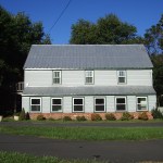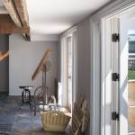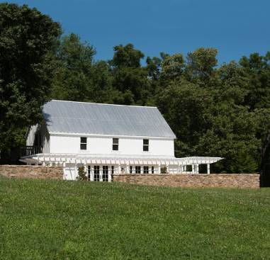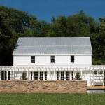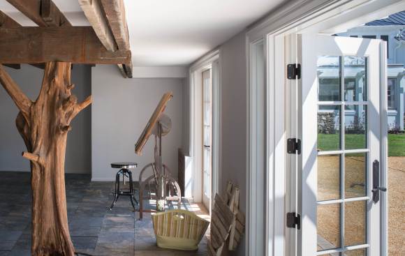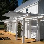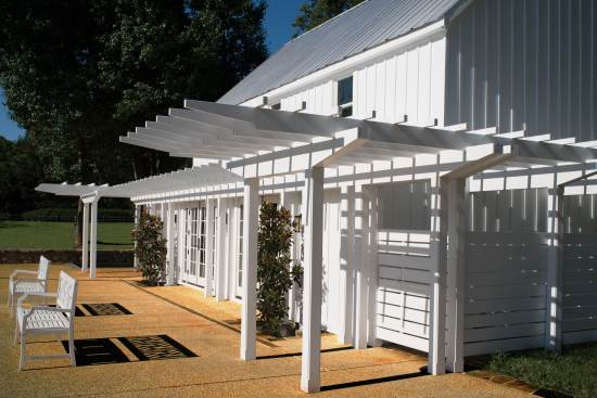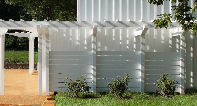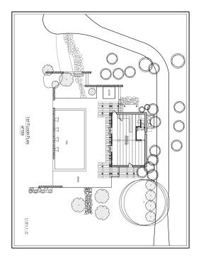 The renovation of the pool house transforms a small farm building to a pool house accessory building replacing vinyl siding with wood. A wood lattice stretches and masks incongruencies of the existing siding and the front bay. A lattice of wood boards masks HVAC and storage. On this lattice a wood trunk and trusses are highlighted.