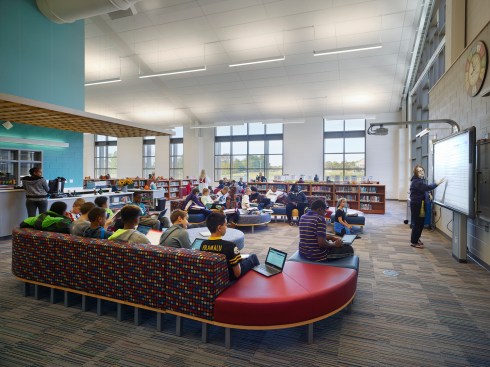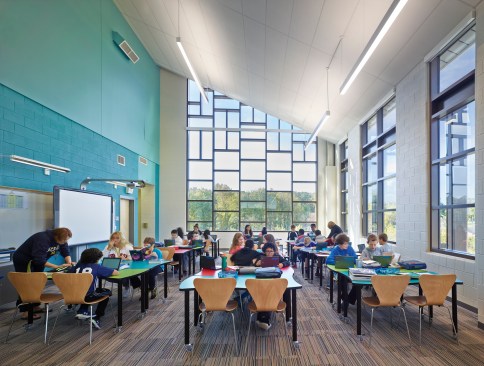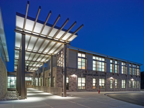 The design is sympathetic to the rural characteristics of the community. Community use of the cafeteria, media center and gymnasium is also being accommodated to encourage connection with the neighborhood. The site contains new athletic fields, a 120-space parking lot, parent drop-off loop, bus loop, tennis courts and basketball courts.