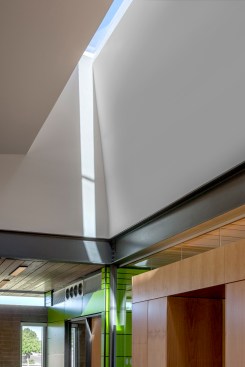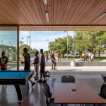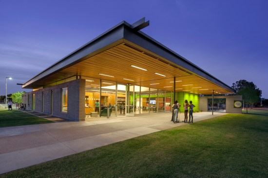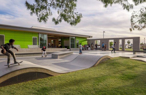 Hermoso Park, a 50-year-old municipal recreational area located in South Phoenix, serves a multi-generational, close-knit community with playgrounds, sports courts, walking trails, and open green space. Hermoso’s city youth program welcomes up to 100 kids each day for after-school meal programs, classes, leadership councils and play. A passionate neighborhood association was vital toward making the project a reality. Originally slated for landscape upgrades, the project grew with additional city funding to include a new 4,000sf recreation center, an 8,000sf skate park, additional restroom buildings, ramadas, and play areas. The Faye Gray Recreation Center building now sits at the park’s epicenter with a design that stretches a limited program, budget and sustainability mandate to achieve an environmentally sensitive, flexible, and inviting home base for the neighborhood. The project shifts the typical room-by-room city program to a singular space – a gesture of unity and efficiency that includes teen/youth rooms, conference space, story room, computer zones, a warming kitchen, and lounge. The small footprint strives for big impact with abundant light, disappearing walls, intimate gathering spaces, and bright colors. Using millwork to divide areas and eliminate space-intensive storage rooms, the center reads as family room flanked by bright green perimeter walls, in high contrast to the exposed concrete structure yet compatible with the building’s natural surroundings.