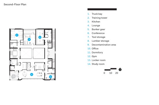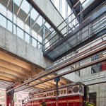 Practically every corner plays double duty. A two-story central atrium brings fresh air and natural light into the truck bay, but its walls are fitted with various window shapes so firefighters can practice rappelling. A trench in the floor opens to simulate a construction-site collapse. Doors at both front and back make it easy to clear out the garage for training drills.