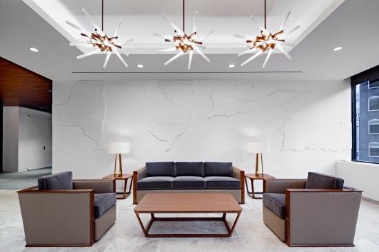 Throughout the space, a warm material palette of bronze metal, light marble, dark grey and brown granite and pops of colorful furniture is employed, creating a modern and welcoming vibe with a nod of sophistication. Specialty materials highlight the main circulation axis of the space, drawing people towards specific areas and key views including communal spaces, meeting rooms and social function areas – all with daylight views. The space’s open plan creates “neighborhoods,” which stimulates interaction among employees, while also providing a level of privacy.