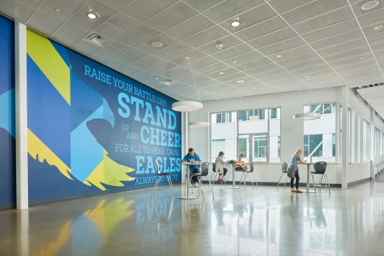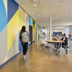 Goals for interior spaces include maximizing daylight, choosing finishes that are not precious, and providing a strong school and community identity through fun graphics developed with the students. To that end, designers intentionally selected simple, inexpensive, and readily replaceable finishes to unencumber the district from adapting the building to ongoing needs, as intended.