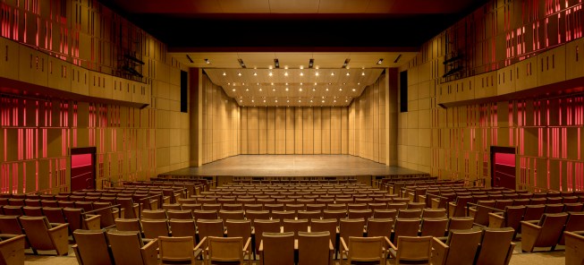 The building represents a hybrid typology—a merging of theater and conference center that strikes a balance between the needs of both while enabling each to function independently. The building’s sculptural form derives from the spatial requirements of its program. Inside, spaces strategically maximize the interrelationships between areas. Meeting rooms, and even the lobby, are morphable and sub-dividable—capable of opening to one another as needed.