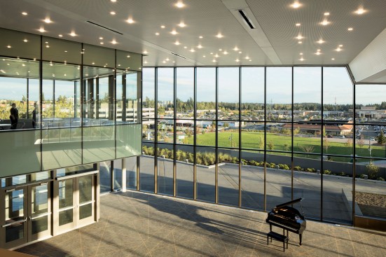 The new Center’s design capitalizes on the prominent downtown location of its 4-acre site, introducing pedestrian connectivity to surrounding uses, as well as new public gathering areas for an active urban presence. Expansive windows on the building’s south and west facades provide dramatic views to downtown Federal Way and Mount Rainier—linking inside and outside activities, while celebrating their remarkable natural setting. A flexible outdoor public space connects the Center to the recently completed Town Center Park and reinforces their shared role in bringing the community together.