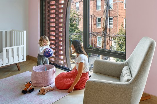 The airy interior of the three-story, four-bedroom house is cocooned by an intricately layered brick screen, a defining element that gives the residence its name. Devised to shelter the house’s extensive glazing and knit the new structure neatly into Philadelphia’s traditional masonry vernacular, the brick façade rises two stories and is supported by a curved steel frame.