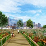 The site features significant wetlands and mature trees that provide a lush outdoor habitat and function as a foil to the laboratory, office and residential buildings. The proposed plan minimizes environmental disturbance and enhances the natural ecology, connecting the campus with a green ribbon weaving through new public plazas and common areas, open views and pathways. Elements such as wetland overlooks and art pavilions are tucked into the landscape for respite, interaction and immersion in nature.