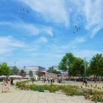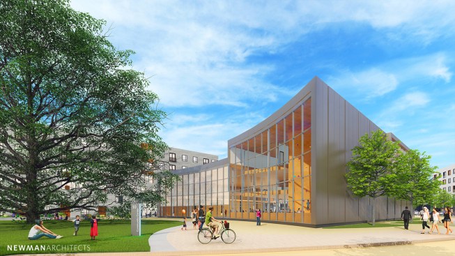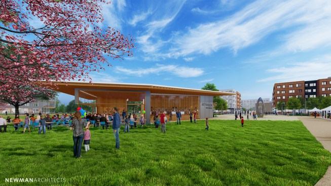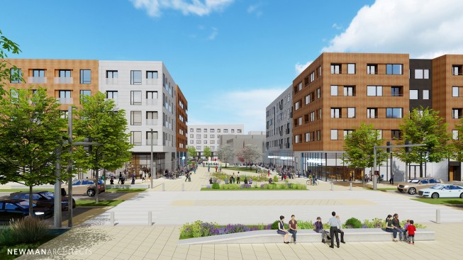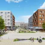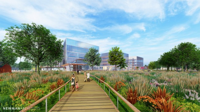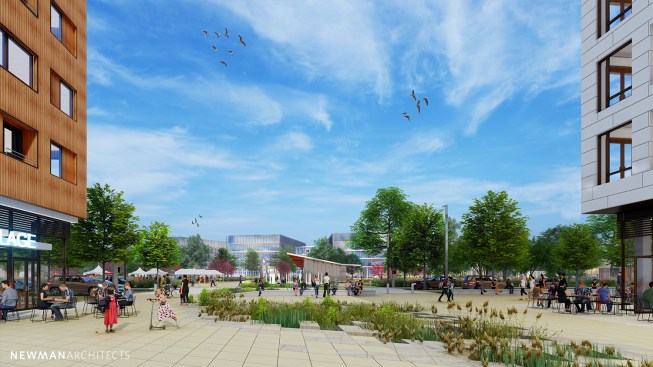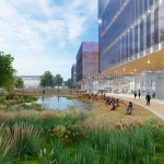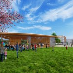 East of Trout Brook Drive will lie a vibrant residential village that incorporates innovative co-living, micro-living and apartment spaces, along with amenities such as dining, retail, activity and community centers, parking and support services. It offers a tapestry of notable destination places, including a central plaza, outdoor amphitheater, community center, an art gallery and a retail/art pavilion set into the landscape, all connected to the pedestrian pathways and main road of the campus.