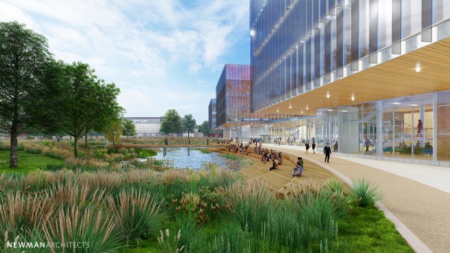 One side of the campus, located to the west of its central road, Trout Brook Drive, will house specialized work spaces for Ideanomics and their partners across multiple buildings. This hub of intellectual workweek activity incorporates office buildings arranged in a dynamic community that is interconnected with its surrounding landscape and wetlands. The open, modern building design is designed to stimulate innovation and creative collaboration, offering state-of-the-art spaces for engineering, offices, research and study, meetings and presentations. Layers of quiet and interactive space, work-related outdoor rooms, and spaces for active and passive recreation are incorporated throughout.