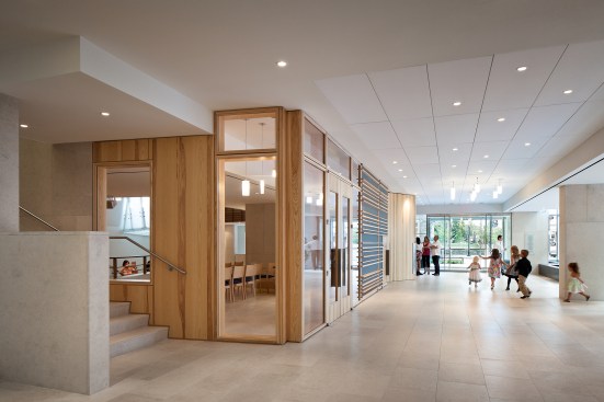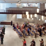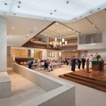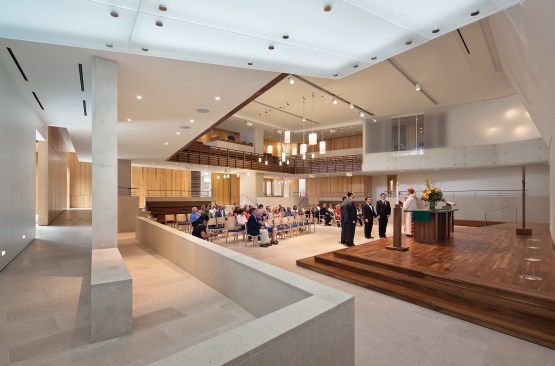 The ample double-height space of the sanctuary is made possible by a substantial transfer beam. Its floors are made of limestone, its walls are paneled in ash, and its ceiling supports a constellation of light fixtures. Custom-designed furnishings include movable seating to accommodate programs ranging from worship services to film screenings. Surrounding the sanctuary on two levels are an intimate chapel, social rooms, and offices. Functional and flexible, the church also serves as a de facto community center.
