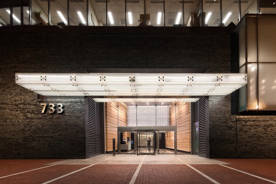 Tod Williams Billie Tsien Architects | Partners designed both the envelope and interiors of the bottom two levels. To mediate between the reflective glass envelope of the upper floors and the cladding of neighboring buildings (which includes the Mies van der Rohe–designed Martin Luther King Jr. Memorial Library, the central facility for the D.C. Public Library), the architects chose a dark, shimmering brick for the church exterior. Street-level glazing welcomes passersby, and a three-story column clad in white bronze doubles as a signpost for the church entrance. Two projecting glass vitrines indicate the main sanctuary and the chapel inside, admitting light by day and glowing like lanterns at night.