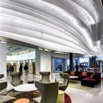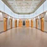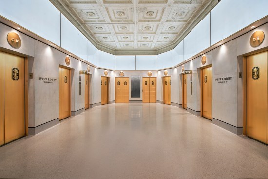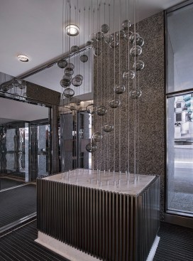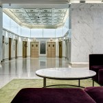 Revitalization of the lobbies included the addition of a barrier-free entrance off of Woodward, a new video display wall, custom-designed LED lighting features, and eye-catching wrap-around LED lighting panels encompassing two elevator lobbies. New marble wall features not only enhance existing marble elements, but act as a backdrop for decorative metal wall panels.