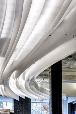 On the exterior, four new canopies add decorative elements reminiscent of the building’s original era. Underneath a more ornate design, and more reflective of a “new” Detroit, LED lights with metal screening complement lobby finishes and detail.